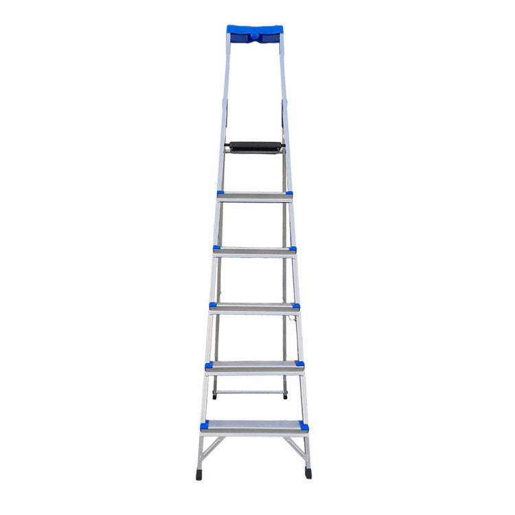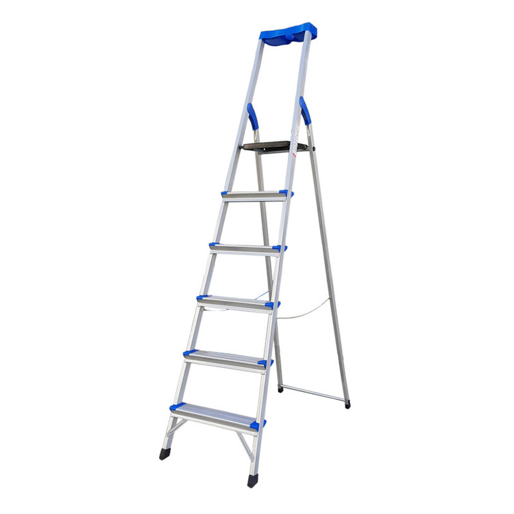 نردبان 6 پله مدل کیهان با استفاده از پروفیل مقاوم تحمل وزنی بیش از 150 کیلو را برای فرد میسر ساخته است. این نردبان نسبت به نردبان های هم رده ی خود با همین تعداد پله از بیشترین ارتفاع در پله آخر برخوردار است که ارتفاع آن در حالت باز شده از زمین تا آخرین پله معادل 160 سانتی متر می باشد. رنگ این نردبان الکترواستاتیک است و از جوش CO و از سیم فولادی در کناره های بدنه، برای استحکام بیشتر نردبان استفاده شده است. پله ی بالایی این نردبان پهن تر از سایر پله ها بوده که استفاده ی طولانی مدت را برای فرد راحت تر می سازد. بیشتر ما زمانی که از نردبان استفاده میکنیم، در صورت نیاز داشتن به ابزار مختلف یا از فردی دیگر درخواست کمک میکنیم و یا خود مجبور به پایین رفتن از نردبان میشویم. اما نردبان پنج پله کیهان با داشتن یک سینی پلاستیکی مخصوص ابزار در قسمت بالای خود، این مشکل را رفع کرده و زمان انجام کار را کاهش می دهد.